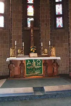 Der dunkelbraun gebeizte Altar wird von Holzfiguren getragen, die, ohne jedoch die entsprechenden Attribute zu halten, auch als die vier Evangelisten interpretiert werden. Die Holzarbeiten an Kanzel und Taufe bezeugen auch hier den NS-Zeitgeist. An der Kanzel gesellen sich ein Soldat, ein SA-Mann und ein Hitlerjunge zu den anderen Figuren aus der Bergpredigt und stellen zugleich die „ideale deutsche Familie“ dar.[4] Auch die hölzerne Taufe zeigt auf einer Seite einen uniformierten SA-Mann,[1] der eine gewisse Ähnlichkeit mit Adolf Hitler aufweist.[4] Auffällig auch der Zeitgeist am Altarkreuz: Dort hängt kein leidender oder sterbender Christus, sondern ein „deutscher Held“ mit trotzig gerecktem Kinn, der den Tod besiegt oder überwindet bzw. überwunden hat.