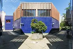 Die Kirche war von Anfang an als Gemeindezentrum, also als ein Komplex unterschiedlich nutzbarer Räume geplant. Der Komplex wurde aus mehreren Baukörpern zusammengestellt, die durch schmale Innenhöfe und Gänge voneinander getrennt sind. Verbindendes Element ist die einheitliche und sehr auffällige Fassadengestaltung, die von leuchtend blau glasierten Keramikfliesen und roten Fensterrahmen und Treppengeländern dominiert wird. Durch die Farbe der Fassadenfliesen erhielt die Kirche schnell den örtlichen Spitznamen „Blaue Kachel“.[2]