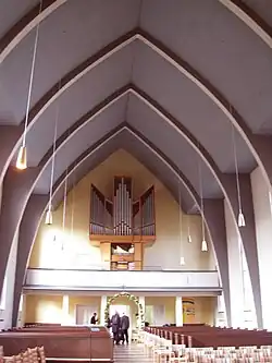 Die hohe Leimbinderkonstruktion gibt dem Kirchsaal ein gotisches Gepräge. Die Holzbinder setzten auf Bodenniveau mit der Krümmung an und überspannen spitzbogig die gesamte Breite des Kirchsaals. Der Chorbogen wurde als Triumphbogen ausgeführt, um den Altarraum hervorzuheben. Zwischen 1955 und 1957 wurde die Kirche unter der Leitung von Max Taut rekonstruiert.[5] Die alte Holzkonstruktion des Spitztonnengewölbes, die vom Hausbock befallen war, wurde durch Stahlbeton-Binder ersetzt. Die Decke wurde mit Akustik-Platten gedämmt.
