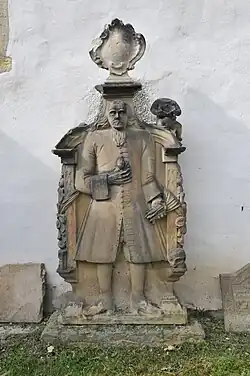 - Eine davon ist etwa 1,50 m hoch. Sie stammt etwa von 1760 und zeigt einen alten Mann mit kleinem Kopf auf breiten Schultern, mit kahlem Schädel und seitlich schulterlang herab fallenden Haaren. Die Stirn liegt in Falten, der Blick ist durchdringend, die Oberlippe des schmallippigen Mundes trägt einen schmalen Schnauzbart mit leicht gezwirbelten Enden, an der Unterlippe „hängt“ mittig ein schmaler Kinnbart. Der Mann trägt über einem etwa hüftlangen Unterkleid einen langen, vielknöpfigen Rock (etwa 25 Knöpfe in einer Reihe) in Magister-Tracht. Er trägt ein Halstuch der damaligen Mode. Die rechte Hand ist vor der Brust gehalten und trägt eine Pflanze, in der herabhängenden Linken sind ein Paar Handschuhe. Insgesamt ist die Darstellung sehr realistisch. Dem Zeitgeist des 18. Jahrhunderts entsprechend, handelt es sich um die lebensnahe Darstellung eines bekannten Menschen (z. B. ein Lehrer, Notar o. ä.), dessen Name auf der Grabplatte nicht genannt zu werden brauchte. Die Gestalt steht vor einer Rückplatte, die als Schweifbogennische gedacht ist, deren Pilaster mit Blumengehängen besetzt ist. Davor stehen auf vortretenden Sockeln links eine Sanduhr (Stundenglas) und rechts ein Totenkopf, Symbole für die Vergänglichkeit des Lebens (siehe Sanduhr und Totenkopf als Sinnbilder der Vergänglichkeit).