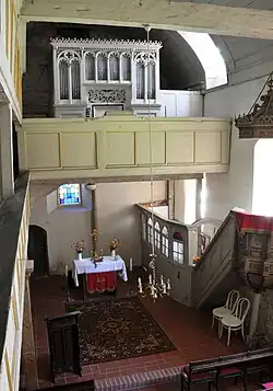 Zur Inneneinrichtung zählt die Orgel. Laut Kirchenbuch[2] wurde im Jahre 1720 eine neue Orgel eingebaut, wozu die Gemeinde 180 (Währung unbekannt, vermutlich Gulden) bezahlt hat. Die gleiche Quelle gibt an, dass die Orgel aus den Mitteln der Gemeinde in den Jahren 1824/25, 1828, 1847 und 1871 (?) repariert wurde. 1863 wurde für 500 Taler eine neue Orgel angeschafft, die noch heute in der Kirche steht. Sie hat zwei Manuale, Pedal und 12 Register. Unbekannt sind der Orgelbauer und die Zahl der Pfeifen, die sichtbaren Pfeifen haben keine musikalische Funktion. Im Jahre 1962 erhielt die Orgel einen neuen Motor.[2]