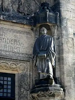 - Lutherkirche zu Zwickau, Figuren des Apostels Paulus mit Schwert und von Martin Luther mit der Bibel links und rechts über dem Haupteingang[2]