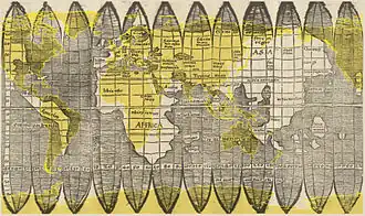 Zuerst wurden die Weltkarte und Bogen für den Erdglobus hergestellt. Noch im gleichen Jahr, am 25. April 1507, erschien die Cosmographiae introductio von Waldseemüllers Auftraggeber, Matthias Ringmann. Globus und Karte zeigten beide den neuen Kontinent mit der Bezeichnung „Amerika“.[15] Die Karte für den Globus wurde als Segmentkarte gedruckt, die sich in Kugelform falten lässt. Von den 1507 hergestellten Globussegmentkarten sind wenige erhaltene Exemplare bekannt, die heute als Original angesehen werden: Eines wurde 1993 im Bestand der Historischen Bibliothek Offenburg entdeckt. Zwei weitere Exemplare werden in den USA aufbewahrt. Ein Exemplar verkaufte der Fürst von Liechtenstein 1954 an die James Ford Bell Library der Universität von Minnesota in Minneapolis, das andere wurde im Jahr 2005 von Christie’s für eine Million US-Dollar versteigert.[16] Diese Karte stellte sich später – ebenso wie ein bereits 1990 von der Bayerischen Staatsbibliothek für damals 2 Mio. DM erworbenes Exemplar, das von der Witwe des renommierten Kunsthändlers Hans Peter Kraus verkauft wurde – als eine nach der Karte der University of Minnesota angefertigte Fälschung des 20. Jahrhunderts heraus.[17]