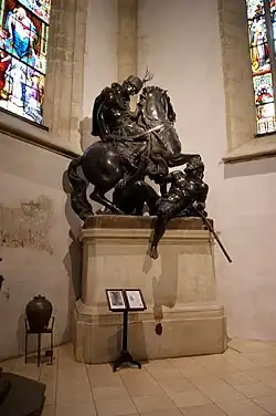 - ↑ Das Kunstwerk entstand im Jahre 1734 in der Preßburger Sommerresidenz des Primas von Ungarn. Massiv gegossen sind nur die Beine des Pferdes und die Füße des Bettlers; die übrigen Teile sind über einem mit Gips ausgefüllten Eisengerippe aus Bleiplatten zusammengefügt und ziseliert. (zit. nach Benyovszky: Bratislava-Pressburg ..., S. 97)