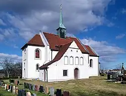 Die Kirche ist ein verputzter Bruchsteinbau in der Art romanischer Dorfkirchen, der inmitten eines Friedhofs liegt. Sie besteht aus einem Saal mit eingezogenem Chor und halbrunder Apsis und wird im Westen durch zwei Strebepfeiler abgestützt. Das Bauwerk wird durch ein Satteldach mit Dachreiter und einem Treppengiebel im Osten abgeschlossen. An der Nordseite sind noch romanische Fenster erhalten, die übrigen wurden im Jahr 1683 vergrößert. Ein spitzbogiges Portal im Norden aus der Zeit um 1400 erschließt das Bauwerk. Im Westen und im Süden wurden zweigeschossige Anbauten hinzugefügt. In der Eingangshalle ist das romanische Südportal mit Rundbogen, umlaufendem Sockelprofil und eingelegtem Rundwulst erhalten. Das Innere ist flachgedeckt, die Apsis hat keine Fenster, Eingeschossige Emporen sind im Westen und an der westlichen Hälfte der Südseite eingebaut.