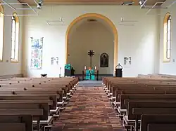 Der ursprünglich neogotische Innenraum wurde im Jahr 1970 nach dem vorherrschenden Zeitgeschmack neuzeitlich umgestaltet. Dabei wurden die vorhandene Ausstattung und die Emporen komplett entfernt. Es entstand eine moderne Saalkirche mit Volksaltar. 1997 wurde das Altarbild des früheren Hochaltars im Chorraum wieder platziert. Dieses Kunstwerk ist der einzige original erhaltene Ausstattungsgegenstand.[2]