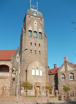 Das Stadtwachstum Köthens dehnte sich auch gen Südosten aus, wo ein Gründerzeitviertel entstand. Dieses erhielt Anfang des 20. Jahrhunderts ein eigenes Kirchengebäude. Als Architekt wurde Friedrich Gothe engagiert, der zuvor bereits mit dem Ersatz-Neubau der Dorfkirche in Gnetsch sein Können bewiesen hatte. Für beide Orte entwarf er einen Rundbau, wobei er in Gnetsch eine reine Zentralturmkirche schuf, bei der die Bauteile um den Turm angeordnet sind, wohingegen er in Köthen östlich von dem runden Kuppelbau Turm, Kirchendienerhaus und Pfarrhaus anordnete. Dadurch entsteht ein V-förmiger Grundriss.[2][3] Besonders markant und eigenwillig ist die Haube des Chorturms.