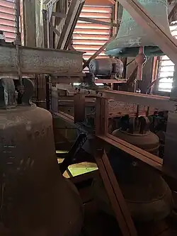 Die Glocken hängen in einem Stahlglockenstuhl der über mehrere Etagen im Turm befestigt ist.