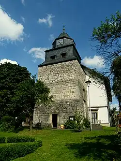Der Kirchturm aus Bruchsteinen im Westen ist im Kern mittelalterlich. Seinen eingezogenen, schiefergedeckten, quadratischen Aufsatz, der den Glockenstuhl beherbergt, erhielt er 1769. Auf ihm sitzt ein achteckiger, mit einer glockenförmigen Haube bedeckter Aufsatz für die Turmuhr. An den Turm wurde 1843 ein klassizistisches Kirchenschiff angebaut.