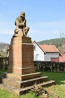 Auf der nördlichen Seite der Kirche steht auf der Wiese ein Ehrenmal für gefallene Bürger Wehrdas im Ersten Weltkrieg. Auf einem Podest kniet ein deutscher Soldat, den Blick gesenkt. An den Seiten sind die Namen der Gefallenen eingraviert, an der Frontseite befindet sich ein Eisernes Kreuz und darunter die Inschrift: „Errichtet von der Gemeinde Wehrda ihren im Weltkriege 1914–18 gefallenen Helden – Weih Herz und Hand dem Vaterland“.