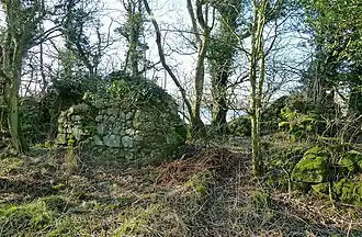 Die Ruinen der alten Burg auf der Insel, die als „Martnam Ynch“ (sic) verzeichnet sind,[4] in der Nähe der Mitte des Sees sind heute noch sichtbar; der Zugang führt vom Südufer aus über einen Steindamm vom Festland zur Insel. Es ist nicht bekannt, wann die Burg errichtet wurde. Sie war bis ins 16. Jahrhundert bewohnt. Die Überreste stammen von einem großen Gebäude mit einer Grundfläche von etwa 21 × 7,5 Metern; die Fundamente eines Anbaus, etwa 12 × 5 Meter groß, sind nordöstlich davon sichtbar. Der Hauptblock war in drei Räume unterteilt, die Mauern bestehen aus vermörteltem Bruchstein, 0,8 Meter dick und bis zu einer Höhe von maximal 2 Metern erhalten. Die architektonische Ausbildung des Bauwerks lässt eine Bauzeit im 16. oder 17. Jahrhundert annehmen. Ein möglicherweise rechteckiges Gebäude am Eingang zum Steindamm war vermutlich ein früheres Torhaus.[5] Das Gelände war viele Jahre lang dicht bewaldet.