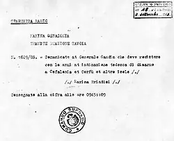 Obwohl Gandin am 11. September 1943 aus Rom vom „Comando Supremo“, dem obersten Heereskommando, den Befehl „1027/CS“ erhalten hatte, „die deutschen Truppen als feindlich zu betrachten“ („considerare le truppe tedesche nemiche“), entschied er sich dennoch gegen den Widerstand seines Stabes und seiner Regimentskommandeure, die Waffen am 13. September um acht Uhr morgens zu strecken, jedoch unter der Bedingung, dass die endgültige Entwaffnung seiner Truppen erst erfolgen dürfe, sobald die Schiffe für die Rückführung seiner Truppen nach Italien Kefalonia erreicht hätten. Auch ein weiterer am Abend des 11. Septembers eingetroffener Befehl aus Rom „1029/CS“, welcher besagte, dass „mit Waffengewalt Entwaffnungsversuchen der Deutschen auf Kefalonia, Korfu und anderen Inseln widerstanden werden muss“ („che deve resistere con le armi at intimazione tedesca di disarmo a Cefalonia et Corfù et altre isole“), wurde dabei von Gandin ignoriert.