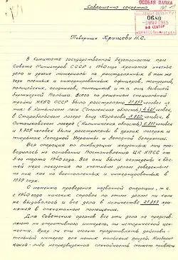 Demnach wurden 14.587 Gefangene an den Zielorten ermordet. 395 wurden ausgenommen und in das Lager Pawlischtschew Bor bei Juchnow verlegt. Nicht erfasst sind hier polnische Opfer aus NKWD-Gefängnissen und Arbeitslagern, in die etwa 4000 Polen aus Pawlischtschew Bor und einige aus den Sonderlagern verlegt wurden.[58] Ein Dokument der UPWI vom Dezember 1943 beziffert die polnischen Sonderlagergefangenen, die von 1939 bis 1941 an regionale NKWD-Stellen übergeben wurden, auf 15.131.[59]