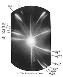 Später, ab dem Jahr 1897, publizierte Joseph J. Thomson verschiedene Experimente,[11][9] in denen er in Vakuumröhren Kathodenstrahlen von verschiedenen Kathodenmetallen mit elektromagnetischen Feldern ablenkte, und stellte korrekte Gleichungen zum Zusammenhang zwischen Masse, Geschwindigkeit und Bahnradius auf. 1913 publizierte er eine Methode, um mit Hilfe eines Massenspektroskops Fotoplatten zu belichten und so qualitative und quantitative Untersuchungen an den in einer Röhre enthaltenen Gasen durchzuführen.