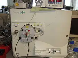 Während des Manhattan-Projekts wurden zum Bau von Atombomben große Isotopenanreicherungsanlagen (Calutrons) gebaut, die nach dem Prinzip von Massenspektrometern arbeiteten.[21] In den 1950er Jahren wurde von Roland Gohlke und Fred McLafferty das erste Mal ein Massenspektrometer als Detektor für eine Chromatographie-Methode eingesetzt.[22][23][24] Beide koppelten einen Gaschromatographen mit einem Massenspektrometer. Durch diese Methode konnten das erste Mal Substanzgemische in einer Anlage getrennt und identifiziert werden.[24][25] Für die Anwendung in einer gaschromatographischen Methode müssen die entsprechenden Verbindungen jedoch im Vakuum flüchtig und dabei unzersetzt verdampfbar sein. Im Jahr 1953 entwickelte Wolfgang Paul den Quadrupol, der eine Selektion der Masse-Ladungsverhältnisse fliegender Ionen ermöglichte.[26]