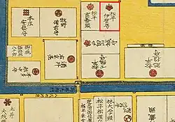 - ↑ Ausschnitt aus der Stadtteilkarte „Daimyo koji“ von ca. 1850.
