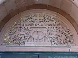 Von der durchgreifenden Umgestaltung verschont blieb der Haupteingang, an dem sich reichere Bauzier konzentriert. Das gestufte Säulenportal ist von einem kleinen Vorbau mit Giebel umgeben. Die Säulen weisen Knospenkapitelle auf. Das Tympanonfeld ist als Relief gestaltet: Auf einem als Goldmosaik anmutenden Grund entfaltet sich, umgeben von Lorbeerzweigen, eine Banderole mit der Bibelinschrift „Herr, ich habe lieb die Stätte deines Hauses und den Ort, wo deine Ehre wohnt“.(Ps 26,8 ). Darüber erhebt sich ein Kleeblattkreuz und ein Brunnen mit mittiger Fontäne und fünf Ausgüssen. Der äußere Rundstab des Portalbogens ist ornamental mit gekreuzten Bändern und Blüten verziert. Über dem Typanon erscheint ein Kleeblattbogenfenster. Die Giebelspitze des Portals sird von einer dreiblättrig reliefierten Blüte ausgefüllt. Eine Kreuzblume bekrönt das Portal.