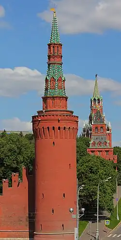 Unmittelbar in die Mauer sind 19 Türme eingebaut, von denen wiederum 18 gleichzeitig mit der heutigen Mauer, in den Jahren 1485 bis 1499, errichtet wurden. Der rein dekorative Zarenturm kam erst 1680 hinzu, und der 20. Turm aus dem Ensemble – der Kutafja-Turm – stellt den einzigen erhaltenen Turm außerhalb der Mauer dar. Er ist mit dem in gleicher Höhe stehenden Dreifaltigkeitsturm durch eine Brücke verbunden, die ehemals über die Neglinnaja führte, und diente als Vorbrückenturm dem zusätzlichen Schutz dieses Kremleingangs. Die Mauer und alle ihre Türme wurden aus Backstein errichtet, was ihnen (mit Ausnahme des weiß gestrichenen Kutafja-Turms) bis heute ihre dunkelrote Färbung verleiht.