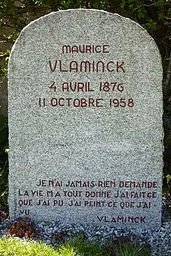 1901 besuchte er die Van-Gogh-Ausstellung in der Galerie Bernheim. Maurice de Vlaminck war so beeindruckt von dieser Ausstellung, dass er sagte: „Van Gogh bedeutet mir mehr als Vater und Mutter!“ Hier lernte er auch Henri Matisse kennen, auf dessen Vermittlung er sich 1905 dem Fauvismus anschloss. Dynamische Linienführung und das Arbeiten mit starken Farben bestimmten sein Werk. Er wandte sich hauptsächlich der Landschaftsmalerei zu.[2] Der Kunsthändler Ambroise Vollard richtete 1906 die erste Einzelausstellung de Vlamincks aus und erwarb dessen Gesamtwerk. Nach 1907 beeinflusste ihn das Werk Cézannes immer stärker. Schon 1908 wendete er sich aber vom Fauvismus ab und dem Impressionismus zu. Ein kurzes Intermezzo mit einigen kubistischen Bildern folgte. Nach einer kriegsbedingten künstlerischen Schaffenspause wurden die expressionistischen Einflüsse 1918 wieder deutlicher. Er reduzierte seine Farben wieder und fand zu einem ganz eigenen Landschaftsstil, der ihn deutlich in den Kreis der Post-Impressionisten stellt.