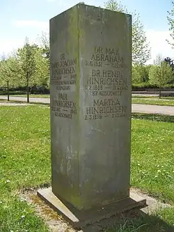 Das Grabmal der Familie Abraham / Hinrichsen auf dem Leipziger Südfriedhof wurde in den 1980er Jahren eingeebnet; seit 1992 erinnert ein Denkmal an den ehemaligen Standort.