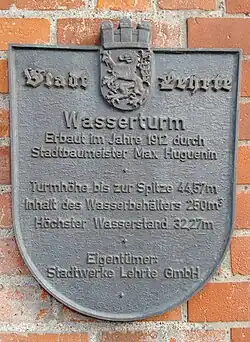 - 1912: Wasserturm der ehemaligen Zuckerfabrik (spätere Hannover Zucker AG) in Lehrte, Germaniastraße 22 (unter Denkmalschutz)[6]