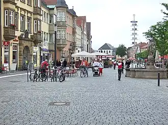 - Die dortige „Mohren-Apotheke“ (1610 eröffnet)[56] ist das älteste noch existierende Geschäft der Stadt. Johann von Gera, ein Apothekenhelfer aus Apolda, hatte dort 1609 drei zusammenhängende Grundstücke erworben und alsbald das Haus errichten lassen. Es verfügte im Hof über einen eigenen Pumpbrunnen und wies als besonderen Komfort sogar ein „Badstüblein“ auf.[55]