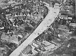 Im Dreißigjährigen Krieg wurde die Stadt 1634 und 1640 geplündert und teilweise zerstört. Das erste bekannte Rathaus der Stadt stand mitten auf dem unteren Markt. Im Jahr 1430 wurde es von den Hussiten mit zahlreichen anderen Gebäuden niedergebrannt. Der 1446 errichtete Nachfolgebau überstand den Stadtbrand von 1621 nicht. Unmittelbar hinter dem Rathaus stand das Brauhaus, vor dem Rathaus war ein Galgen aufgerichtet. Lange Zeit markierte ein schwarzes Dreieck im Straßenpflaster diesen Richtplatz.[11] Vermutlich war der Galgen an dieser Stelle aber nur das Wahrzeichen der Hohen Gerichtsbarkeit: Vollstreckt wurde die Todesstrafe in der Regel auf dem Galgenberg, dem Rabenstein und der Henkersau in heutigen Stadtteil Kreuz.[12]