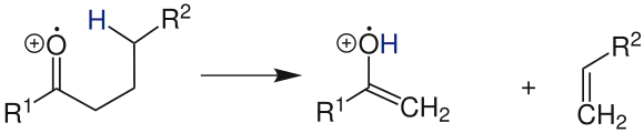 Zunächst läuft über einen sechsgliedrigen Übergangszustand die Übertragung des Wasserstoffatoms aus der γ-Position auf das radikalische Heteroatom ab. Das dann dreifach gebundene (Hetero-)Atom trägt nun eine positive Ladung, während das Kohlenstoffatom an der γ-Position nun als Radikal vorliegt. Da primäre bzw. sekundäre Radikale thermodynamisch und kinetisch instabil sind, erfolgt eine Bindungsverschiebung und das neutrale Abgangsmolekül (hier: ein Alken) wird abgespalten. Das Radikal liegt nun direkt neben einer Doppelbindung, die besser in der Lage ist, es durch mesomere Effekte zu stabilisieren. Diese bessere Stabilisierung ist die Triebfeder für die Abspaltung des kleinen Moleküls.