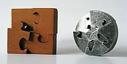 Verzahnende Puzzles sind zum Beispiel die bekannten chinesischen Holzknoten, die bisweilen auch Teufelsknoten[1] genannt werden. Die Aufgabe besteht darin, das Spiel zu zerlegen und dann wieder zusammenzusetzen. Beide Aktionen können kompliziert sein. Im Gegensatz zu den Zusammensetz-Puzzles haben verzahnende Puzzles die Eigenschaft, nicht einfach auseinanderzufallen. Der Schwierigkeitsgrad dieser Puzzles wird angegeben als Anzahl von Zügen, die notwendig sind, um beim Auseinandernehmen das erste Teil aus dem Puzzle zu entfernen. Das Bild zeigt den bekanntesten Vertreter dieser Kategorie, den chinesischen Holzknoten, bei dem 5 Bewegungen benötigt werden, bevor das erste Teil entfernt werden kann.