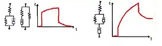 rechts: Typisches Dehnungsdiagramm einer anoelastischen Relaxation mit zugehörigem Feder-Dämpfer-Diagramm.