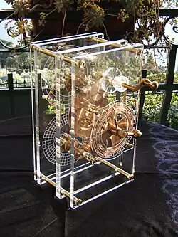 Mit einer Uhr hat der Mechanismus von Antikythera generell gemein, dass er mit Zahnrädern und Zeigern über runden Skalen ausgerüstet ist. Er hat viele Zeiger und Zifferblätter wie eine etwa ab dem 16. Jahrhundert n. Chr. gebaute astronomische Kunstuhr.[13] Mit dieser verbindet ihn aber auch der Verlust an Anschaulichkeit im Vergleich zur ab dem 14. Jahrhundert n. Chr. gebauten größeren astronomischen Uhr, die wie das Astrolabium mehrere Zeiger auf nur einem Zifferblatt hat und den Stand von Sonne und Mond nicht nur relativ zueinander und vor den Fixsternen, sondern auch relativ zum Horizont zeigt.