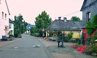 Der Ort ist insbesondere durch seinen Dorfplatz gekennzeichnet, der von der Alten Schule (in den 1960er Jahren bis 2011 als evangelische Kirche genutzt) und dem Alten Backhaus (Backes) umgeben ist. In der Mitte des Dorfplatzes wächst eine Linde, die von einer Bank eingerahmt wird. Alle zwei Jahre bildet der Dorfplatz auch das Zentrum des Rosenfestes am Fronleichnamstag.[2]