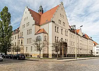 Das Gebäude ist ein dreigeschossiger, der Reformarchitektur zuordenbarer Dreiflügelbau mit Putzfassade und Granitsockel. Der 63 Meter langen Hauptfront schließen sich zwei unterschiedlich lange Seitenflügel an. Ein offener Turmstumpf und ein kleiner Wellengiebel markieren die Mitte des Längsflügels. Sein Dach trägt zwei mehrfenstrige Gauben mit einer Glockenhaube. Die Südostecke bilden zwei hohe Wellengiebel über lisenenartig leicht hervortretender Wand mit dem Gebäudeeingang. Auf dem Schnittpunkt ihrer Dächer sitzt ein kleiner Turm mit Laterne. Auch an der Nordwestecke tritt die Wand hervor, aber die Giebel fehlen. In dem sich anschließenden Seitenflügel ist das Dachgeschoss ausgebaut.