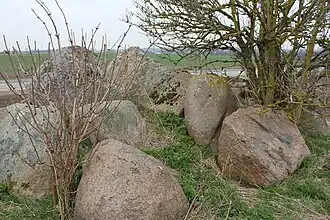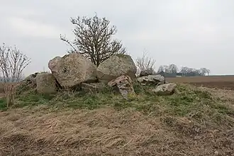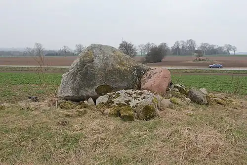 Das stärker gestörte Ganggrab (dänisch Jættestue) liegt im Feld westlich der Straße. Es besteht aus fünf Steinen im Westen (drei in situ), 3,5 Steine im Osten (einer in situ) zwei umgestürzten Steinen im Norden, sowie 2,5 Decksteinen. Der angegrabene Hügel misst etwa 8,0 × 6,0 m.