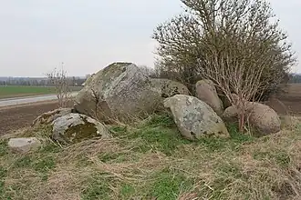 Der freistehende Dolmen liegt im Feld östlich der Straße. Der Deckstein liegt zwischen den fünf nach außen verkippten Tragsteinen. Auf dem Deckstein befinden sich zwei Schälchen. Der Rundhügel hat etwa 6,9 m Durchmesser.