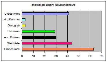 Im Rahmen einer Arbeitsgemeinschaft zwischen dem Institut für Ur- und Frühgeschichte der Deutschen Akademie der Wissenschaften zu Berlin und dem Museum für Ur- und Frühgeschichte Schwerin wurden zwischen 1965 und 1970 insgesamt 106 von 1145 nachweisbaren Megalithgräbern ausgegraben und die vorgefundenen Gräber dokumentiert und klassifiziert. Die Abbildungen zeigen die Anzahlen der verschiedenen Typen für die drei ehemaligen DDR-Bezirke auf dem Gebiet des früheren Landes Mecklenburg einschließlich Vorpommerns.[6]