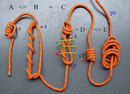 - Mehrfach regelmäßig ins Seil geknüpft dient er als Ersatz für eine Strickleiter[2]. Alternativ können Holzsprossen am Ende durchbohrt und das Seil durchgezogen und unter der Sprosse verknotet werden.