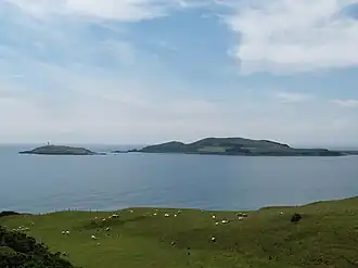 ![]() Blick über die Kircudbright Bay auf Meikle Ross (rechts) und Little Ross (links). | ||
