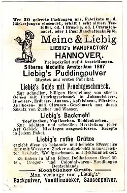 Ebenfalls 1878 fanden die Produkte von Meine & Liebig auf der Pariser Weltausstellung zahlreiche Abnehmer. Da insbesondere Großbritannien an den Fabrikaten interessiert war, wurde die Firma aus Gründen des Marketings in Liebigs Manufactory von Meine & Liebig geändert[3], wobei sich der vorangestellte Name Liebig umsatzfördernd auswirkte.[4] Der Export setzte jedoch bald auch in die Niederlande ein, nach Belgien und Schweden sowie Südamerika. 1891 wurde das Drogengeschäft verkauft, um sich ganz auf die Produktion von Back- und Puddingpulver zu konzentrieren.[3] Obwohl der Begriff Fertignahrungsmittel noch nicht etabliert war, fanden sich neben den Produkten von Meine & Liebig Ende der 1870er Jahre Begriffe anderer Anbieter auf dem Markt, beispielsweise Liebig’s Fleischextrakt, Nestlé-Kindermehl und Timpes Kraftgries.[4]