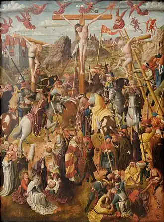 Der Meister der Benediktbeurer Kreuzigung beschränkt den Kreis seiner Figuren um das Kreuz nicht, sondern er malt das vor allem in der christlichen Kunst nördlich der Alpen seit 1400 verbreitete Motiv eines sogenannten volkreichen Kalvarienbergs.[4][5] Seine Kreuzigungsdarstellung ist ein typisches Beispiel dieser Altarbilder, die Scharen von Menschen aus dem Volk auf der Hinrichtungsstätte Christi darstellen. Der Maler will gleichsam die Figuren als Stellvertreter ihres Betrachters am Geschehen teilnehmen lassen. Dem Meister der Benediktbeurer Kreuzigung gelingt es unter anderem, Tortur und Leiden einer Hinrichtung so darzustellen, wie es die zeitgenössischen Betrachter seines Werkes aus ihrem Umfeld kannten.[6][7] Er ruft damit Anteilnahme und ein Mitleiden hervor, der Betrachter kann göttliche Wahrheit gleichsam „sehen“ und „berühren“. Der Meister der Benediktbeurer Kreuzigung ermöglicht dem Betrachter mit seinem Gemälde die aktive Rolle, die Nikolaus von Kues in seinen theologischen Werken um 1450 für den gläubigen Christen formulierte.[8] Es wird vermutet, dass Abt und Mönche mit den Werken des Nikolaus von Kues vertraut waren und dem Maler mit dem Auftrag zum Werk auch theologische Argumente in Anlehnung an Kues vorgegeben haben.