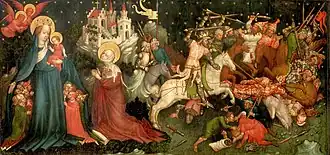 Die Votivtafel des Meisters der St. Lambrechter Votivtafel kombiniert ein historisches Ereignis mit einem Andachtsbild. Es wird vermutet, dass das Bild den Kampf von König Ludwig I. von Ungarn 1377 gegen die Osmanen und Bulgaren behandelt. Von Wilhelm Suida wurde diese Türkenschlacht stattdessen zwischenzeitlich als Schlacht bei Radkersburg fehlgedeutet.[5]