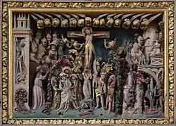 Die Kreuzigungsreliefs wurden als Altarschreine aus Sandstein erstellt und enthalten vollplastische Figuren, die mehrfarbig bemalt sind. Sie stellen die Kreuzigung Christi dar. Ihre Zuweisung an einen gemeinsamen Meister basiert auf der stilistischen Ähnlichkeit dieser Arbeiten in Darstellung und Form sowie auf den zahlreichen gemeinsamen Details.[3] Die die Kreuzigungsreliefs umgebenden Flügelaltäre sind oder waren aus Holz.