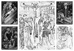 • Kreuzigungstafel aus St. Barbara in Děbolin bei Neuhaus (um 1380; 125,5 × 95 cm; Tempera und Gold auf Fichte; Nationalgalerie Prag Inv. Nr. O 577)[7]