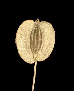 Die reife Spaltfrucht, Doppelachäne genannt, ist weiß-gelblich mit bräunlicher Scheibe. Sie ist bei einer Länge von 4 und 5 Millimetern und fast gleicher Breite beinahe kreisrund. Sie ist stark zusammengedrückt, dabei am oberen Ende etwas ausgerandet. Die drei stumpflichen Rückenrippen der Teilfrüchte sind im Querschnitt dreikantig vorspringend und durch abgerundete Buchten voneinander getrennt. Die dünnen Randflügel sind sehr breit, fast so breit wie der Gehäusedurchmesser an der breitesten Stelle. Verdickte und verholzte Querfaserzellen sind nicht vorhanden. Obwohl das Gewebe der Fruchtwand und der Flügel teilweise fein getüpfelt ist, ist es parenchymatisch und bis auf die leicht dickwandigen Oberhautzellen der Flügelschneide kaum wesentlich verdickt. Die Leitbündel sind deutlich ausgeprägt. Unter den Tälchen verlaufen die Ölstriemen einzeln, an der Fugenfläche zu zweit. An den Leitbündeln der Flügel verlaufen außen Ölstriemen in Einzahl. Die Ölstriemen auf den Leitbündeln der Rückenrippen sind verkümmert.[2]