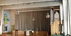 Der Kirchsaal im ersten Obergeschoss ist mit über 300 Plätzen flexibel nutzbar und verfügt über eine Bühne. Ein turmartiger Erweiterungsbau von 1973 bis 1974 nach Plänen des Architekten Reinhold Barwich auf dem rückwärtigen Teil des Grundstücks, der mit dem vorhandenen Bau verbunden ist, enthält zusätzliche Räume für den Kindergarten und Jugendtreffs.