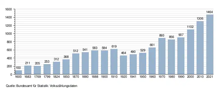 - ↑ Daten der Eidgenössischen Volkszählungen ab 1850 nach Gemeinden. (XLSX; 10 MB) Bundesamt für Statistik, Neuchâtel, 12. Juli 2024, abgerufen am 19. April 2025 (Öffnung in Excel nur über "Anhang/Excel-Datensatz" möglich).