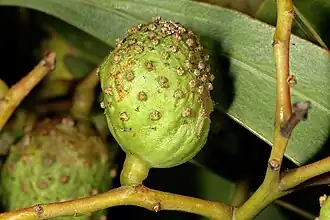 Blütenstand einer Gold-Akazie mit Gallen von Trichilogaster acaciaelongifoliae | ||||||||||||