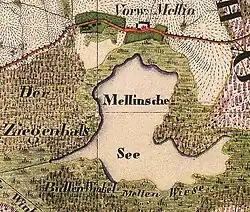 1721 plante Amtspächter (Arrendator) Gustav Krause von der Grimnitzschen Glashütte die weitere Räumung von Land, um an dieser Stelle ein Vorwerk aufzubauen. Kleinfeld hatte zu diesem Zeitpunkt bereits 288 Morgen (1 Morgen zu 180 Quadratruten) Land und 46½ Morgen Wiesen geräumt. 1722/3 wurde das Vorwerk erbaut; es sollte Mellin heißen. Bei der Vermessung der Vorwerkländereien 1732 gehörten zum Vorwerk insgesamt 322 Morgen Land, davon 288 Morgen Acker, 69 Morgen Wiese und 25 Morgen Gartenland. 1736 wohnten 2 Hausleute, ein Schäfer, ein Knecht und eine Magd auf dem Vorwerk. 1746 wird die Größe des Vorwerks mit 386 Morgen angegeben, davon waren 238 Morgen Acker, 145 Morgen Wiesen und 3 Morgen Garten. Es wurden 20 Kühe, 10 Stück Güstevieh, 200 Schafe sowie Schweine und Federvieh gehalten. Inzwischen waren auch 3 Tagelöhnerwohnungen entstanden. Zu den Aufgaben des Vorwerks gehörte aber immer noch die Unterhaltung des Wildzauns. Mit Ablauf der Pachtperiode 1756 (des Amtes Liebenwalde) wurden die Vorwerke Grumsin und Mellin dem neuen Amt Grimnitz zugewiesen 1768 wurde 8 mecklenburgische Büdner (oder Tagelöhner) auf königliche Kosten beim Vorwerk angesetzt. Die acht Familien aus Woldegk, Canzow und Strelitz wurden in 2 Wohnhäusern untergebracht. Sie erhielten 1769 per Erbverschreibung je 1 Morgen Wiese und ¾ Morgen Gartenland. 1774 wurde Amtmann und Pächter Gustav Krause wegen Pachtrückständen von 5.800 Talern entlassen.[3] 1775 wurde das Vorwerk Mellin an Amtmann Böttcher in Erbpacht gegeben. Beim Vorwerk wohnen 8 Büdner, die Kolonie zählte acht Feuerstellen. 1790 hatte die Kolonie 16 Einlieger und 7 Feuerstellen. 1801 lebten 10 Büdner und 6 Einlieger in Mellin. Erstmals ist ein Krug belegt. 1840 war der Ort auf elf Wohnhäuser angewachsen. 1860 wurden in Mellin ein öffentliches Gebäude, sechs Wohnhäuser und sieben Wirtschaftsgebäude registriert. 1859/61 kaufte der Besitzer von Polssen und Schmelze, Moritz v. Wedell-Parlow die Kolonistenhäuser auf. Die Bewohner wanderten nach Amerika aus. 1864 wurde die Schule abgebrochen. Die Kolonistenhäuser wurden noch einige Jahre als Tagelöhnerhäuser genutzt. 1880 vereinigte der Rittergutsbesitzer v. Wedell-Parlow Mellin mit dem Nachbarort Schmelze (ab 1880 dann Parlow genannt) und ließ das Vorwerk und die Kolonistenhäuser in Mellin abreißen. Heute ist von dem kleinen Ort nichts mehr erhalten.