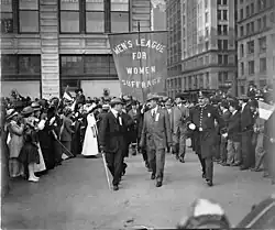 Unter den neuen Mitglieder der Liga waren einflussreiche Männer aus allen gesellschaftlichen Bereichen.[9] Später hatten Mitglieder wie George Creel und Dudley Field Malone Zugang zu Präsident Woodrow Wilson und versuchten, ihn im Sinne der Unterstützung des Frauenwahlrechts zu beeinflussen.[9] Malone trat wegen der Frage des Frauenwahlrechts von Amt des Collector of the Port of New York, in das ihn Wilson berufen hatte, zurück.[9]