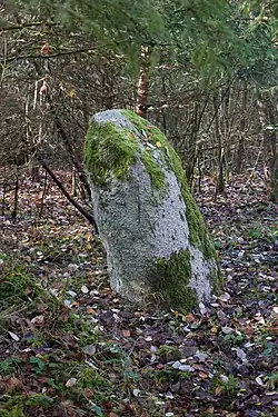 „1948 wurde in einem Waldstreifen südlich der Kreisstraße Dossenbach–Wehr zwischen Pt. 454,0 m und 474,7 m[2] ein Monolith aus grauem, körnigen Albtal-Granit entdeckt. Er war infolge einer Ausgrabung an seiner Basis in östlicher Richtung umgestürzt. […] Diesbezügliche Nachforschungen bei älteren Ortsansässigen, denen der menhirartige Monolith unter dem Namen ‚der Stein‘ (mdal. de Stai) wohlbekannt war, ergaben als mutmaßlichen Zeitpunkt der Ausgrabung das Jahr 1936. Bis dahin dürfte die Steinsäule noch aufrecht gestanden haben. Man wußte überdies zu berichten, daß der Granitblock schon Mitte der zwanziger Jahre hätte als Gedenkstein für ein Kriegerdenkmal in das Dorf abtransportiert werden sollen; er sei für diesen Zweck als zu niedrig befunden und deshalb an Ort und Stelle belassen worden. Der umgestürzte Monolith wurde 1963 wieder aufgerichtet.“